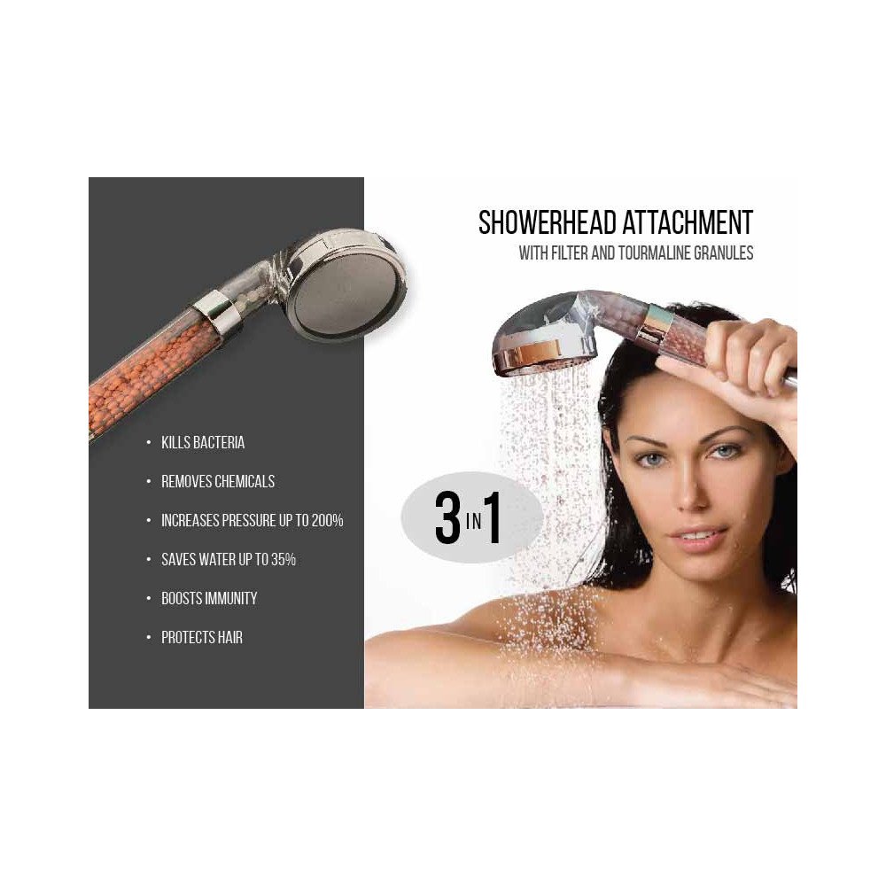 Filtra dušas galva nogalina baktērijas un ķīmiskās vielas, kā rezultātā uzlabojas cirkulācija, imunitāte, enerģijas līmenis un vispārējā labklājība. Tas arī palielina ūdens spiedienu līdz 200% un ietaupa līdz 35% ūdens. Turmalīna uzgalim ir 5 veidu iedarbība uz ķermeni, kas palīdz stimulēt imūnsistēmu, darbojas kā antioksidants, aizsargā pret matu izkrišanu un atjauno organismu.